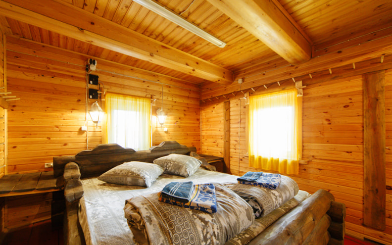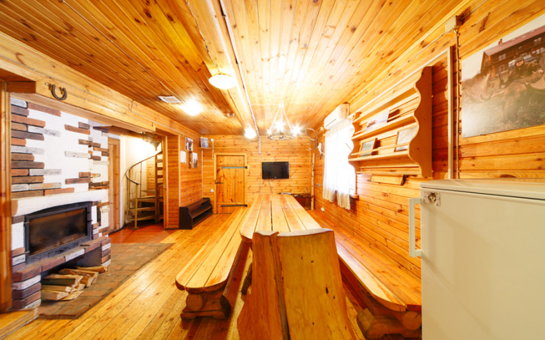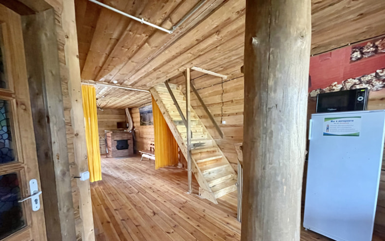 Коттедж в Витебской области двухэтажный, вмещает 8-9 человек. На первом этаже находится большая гостиная с камином. На втором ― спальни, душевая комната и санузел. Интерьер дома выполнен из дерева, в классическом загородном стиле.